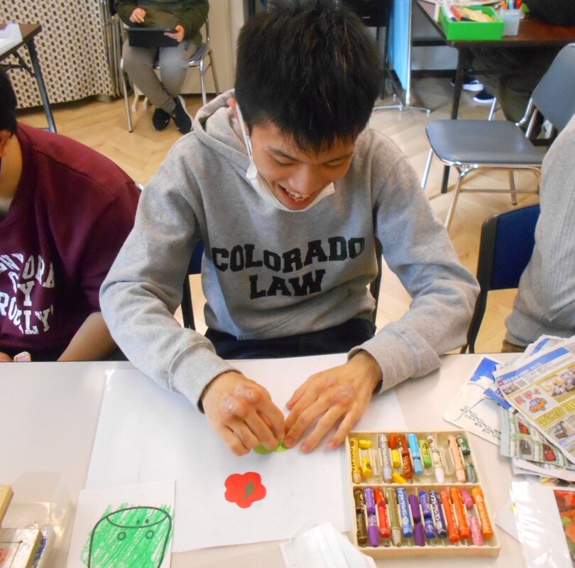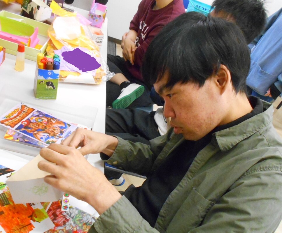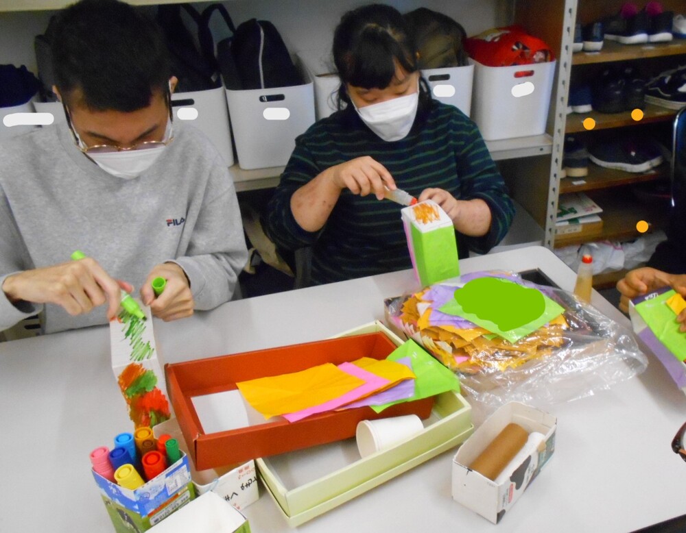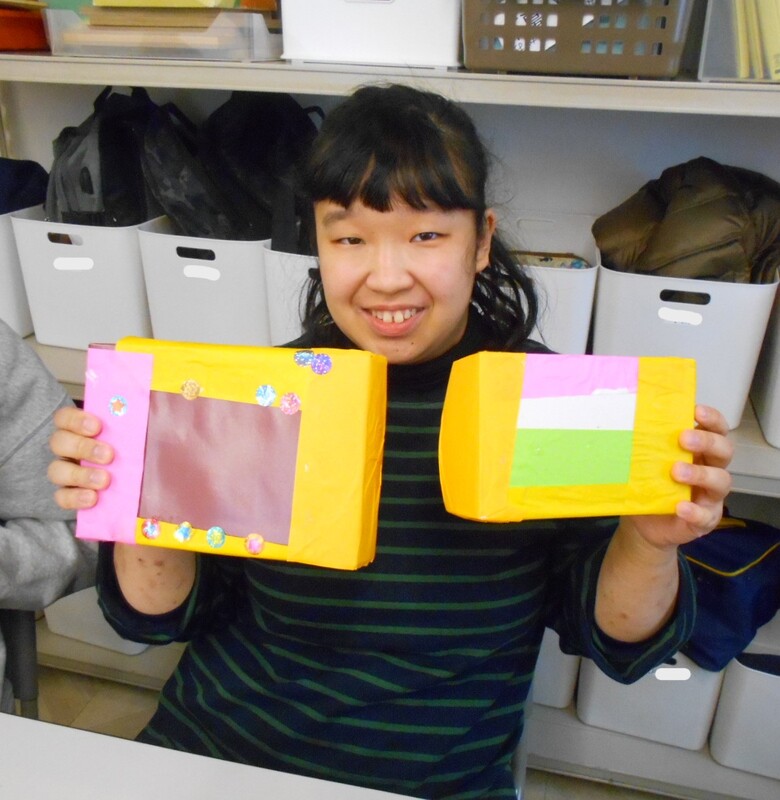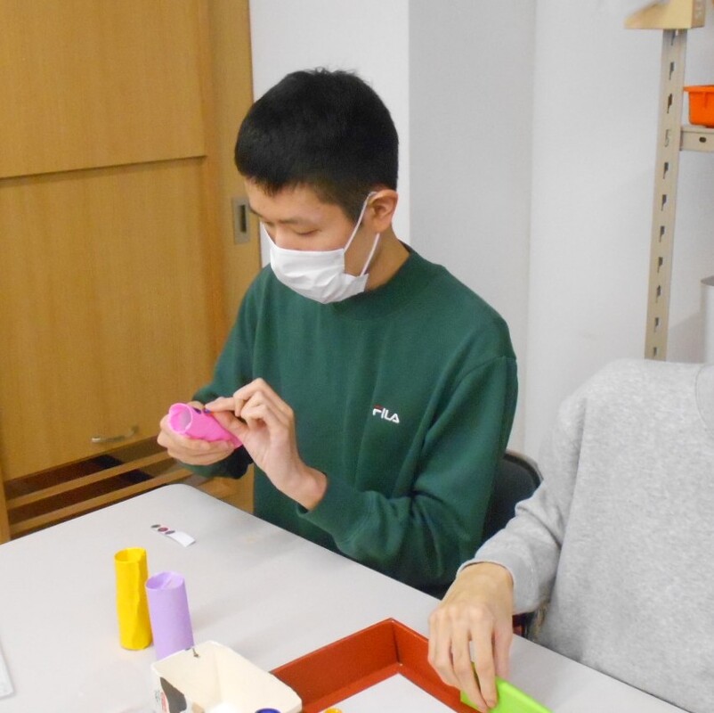 昨年、最後の通所日27日(土)に、いろいろな空き箱や、トイレットペーパーの芯で、小物入れなどを作られました。