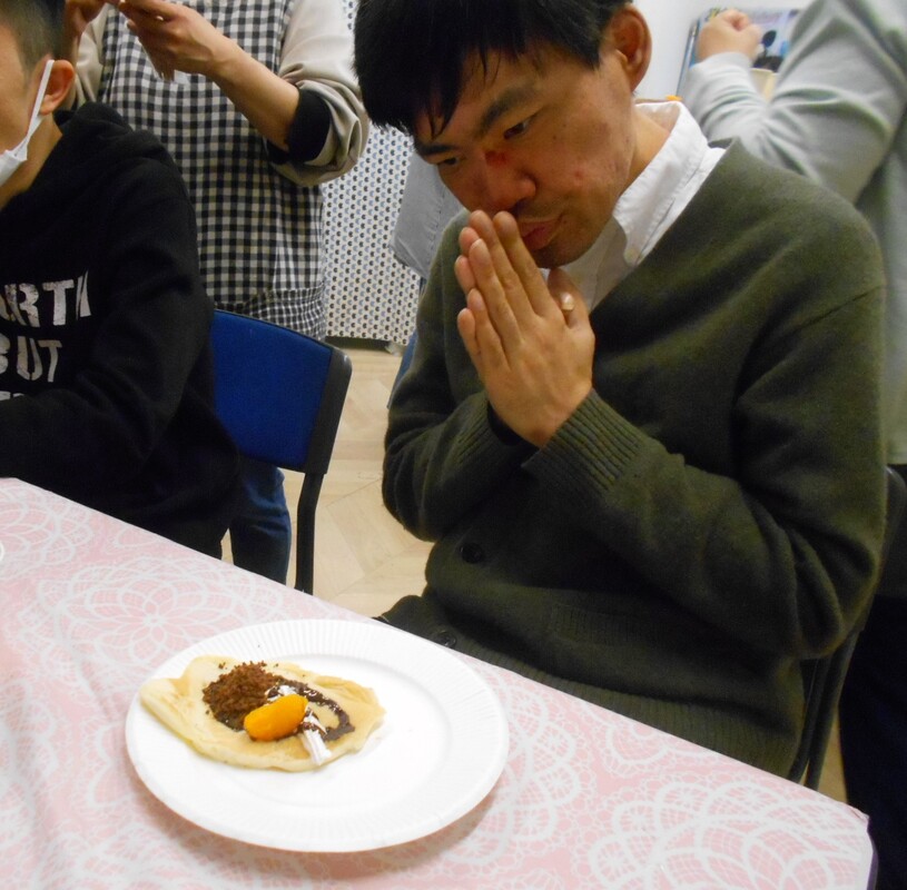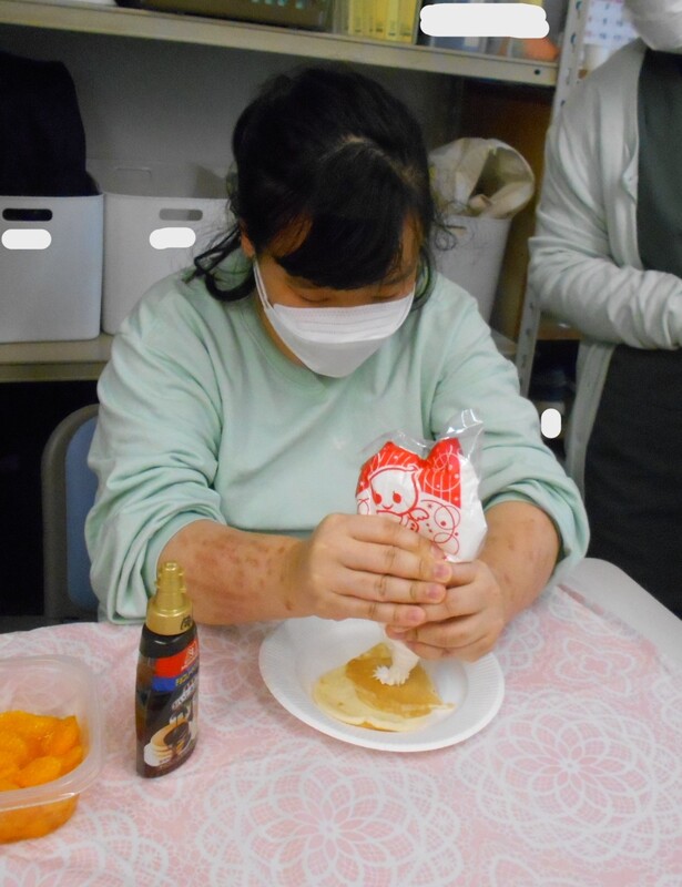本日は、「自分で焼いたホットケーキを食べるぞ~!(^^)!」ってことで、エプロンに三角巾をつけて、ホットケーキ作りに挑戦されました。上手にま~るくしたり、フライ返しで返したりされ、美味しそうなホットケーキができあがりましたね(#^.^#) 出来た後は、ホイップクリームやチョコなどトッピングされ、笑顔で召し上がっていました。お菓子も少しとジュースも飲まれ、笑顔いっぱいでした!